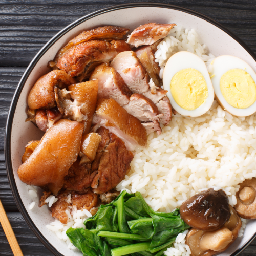Khao kha moo (Thai braised pork leg) är en klassisk thailändsk rätt gjord på långsamt bräserad grislägg som tillagas med en blandning av aromatiska kryddor, inklusive stjärnanis, kanel och Shiitake svamp. Den serveras med jasminris och hårdkokta ägg. Den långsamma bräseringen gör att köttet blir otroligt mört och suger åt sig all rikedom från buljongen som det sjuder i.
